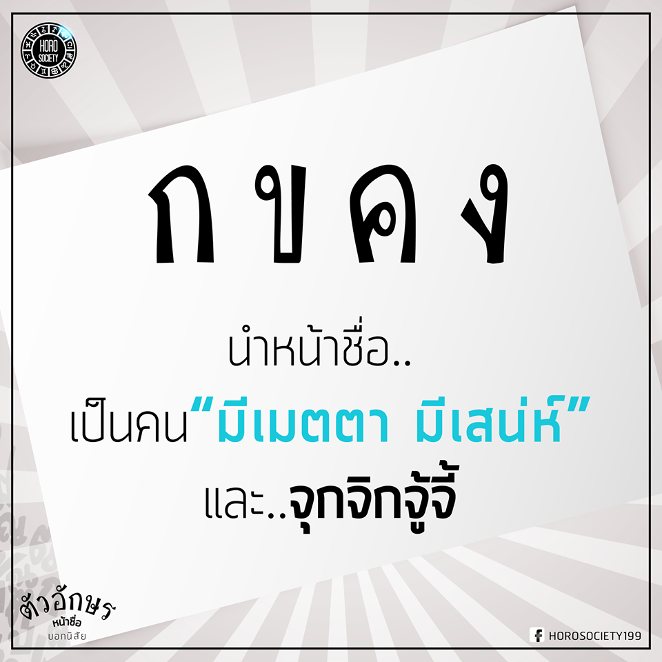 คนที่มีอักษร ก ข ค ง นำหน้าชื่อ มักเป็นผู้มีจิตใจเอื้อเฟื้อแก่ผู้คน ใจอ่อน ชอบบริการคนอื่น มีเมตตาธรรมขี้สงสาร เรียบร้อย สุภาพ อ่อนโยน เข้ากับคนง่าย รักความเป็นระเบียบ รักความสะอาด มีเสน่ห์ มีความคิดหลากหลายโครงการมาก แต่มักมีความหวั่นไหวในตัวเอง ขาดความมั่นใจในหลายเหตุการณ์ สับสน แต่ก็เป็นคนที่เชื่อคนง่าย จึงมักตกอยู่ในอิทธิพลของคนอื่นได้ ทั้งยังใจน้อยแสนงอน เพ้อฝัน ชอบสร้างวิมานในอากาศ คิดเกินขอบเขต ทำคุณคนไม่ขึ้น จุกจิกจู้จี้ เจ้าระเบียบเกินกว่าเหตุ และเป็นคนใจอ่อน