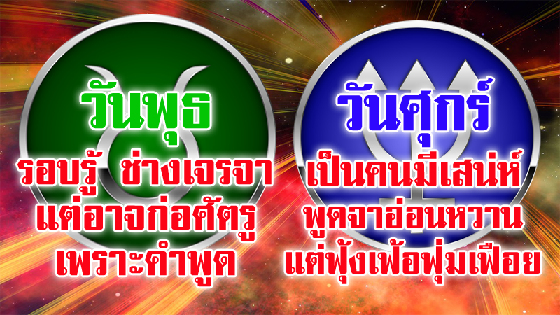นิสัยใจคอ – รักสวยรักงาม รักสนุก ชอบความบันเทิง ชอบแต่งตัว ชอบสังคมชอบความหรูหรา ชอบศิลปะ เป็นคนเจ้าชู้ พูดโน้มน้าวจิตใจคนได้ดี พูดจาอ่อนหวาน(มักโอ้อวดอยู่บ้าง) ประหยัดมัธยัสถ์ เป็นคนยิ้มแย้มแจ่มใส ไม่เอาทุกข์ไปให้ใครเห็น ทุกข์เก็บไว้ในใจคนเดียว เฮไหนเฮนั่นไปกับเขา แต่พอกลับบ้านมาอาจนั่งร้องไห้คนเดียว เพราะคนเกิดวันศุกร์คือคนธรรพ์ ชอบดนตรี เสียงเพลง ชอบของสวยๆงามๆ รูปร่างอวบๆ ศุกร์คือกิเลส ตัณหา การเงิน ความรัก เพราะฉะนั้นคนที่ดาวศุกร์เสีย ความรักก็เสีย การเงินก็เสียไปด้วย