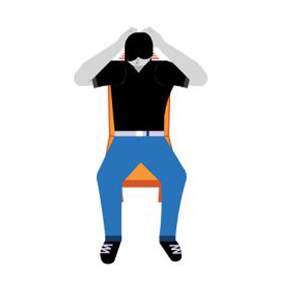 ท่าที่ 5 ท่ายืดกล้ามเนื้อบ่า เอียงศีรษะไปด้านข้างใช้มือข้างเดียวกับที่เอียงไปช่วยดึงศีรษะไป มืออีกข้างจับขอบเก้าอี้