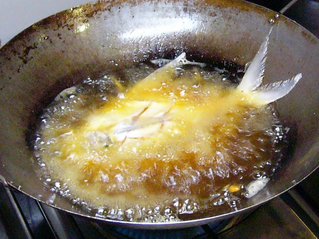 อันดับแรกต้องซับน้ำออกจากเนื้อสัตว์ให้แห้งสนิท แล้วนำไปคลุกแป้งสาลีเล็กน้อย ก่อนทอดเช็ดกระทะให้แห้ง โรยเกลือเล็กน้อยลงในกระทะ คั่วเกลือไปมาสักพักจากนั้นตักออก แล้วเทน้ำมันลงกระทะ นำเนื้อสัตว์ที่คลุกแป้งสาลีไว้แล้วลงทอดในน้ำมันตามปกติ