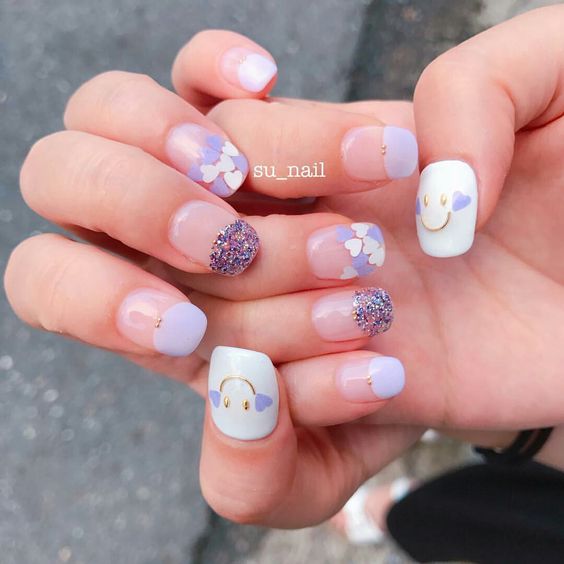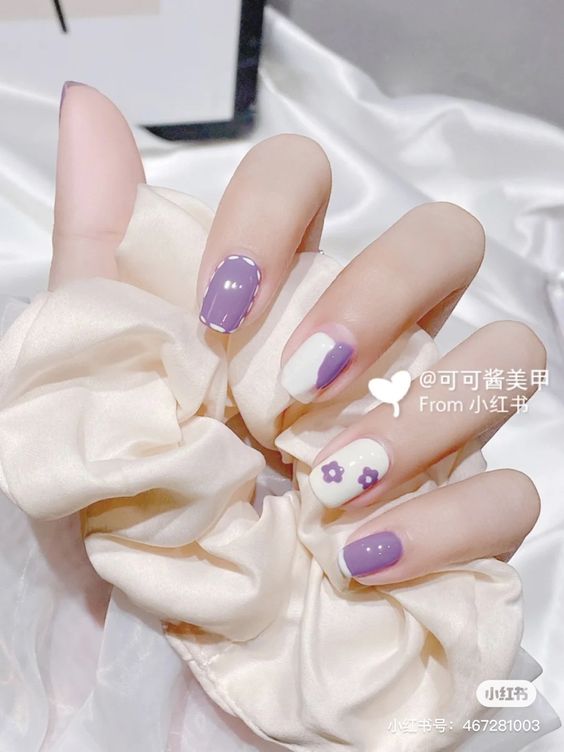 ไอเดียเล็บเจลน่ารักๆ สีม่วงพาสเทลกับสีขาวครีม