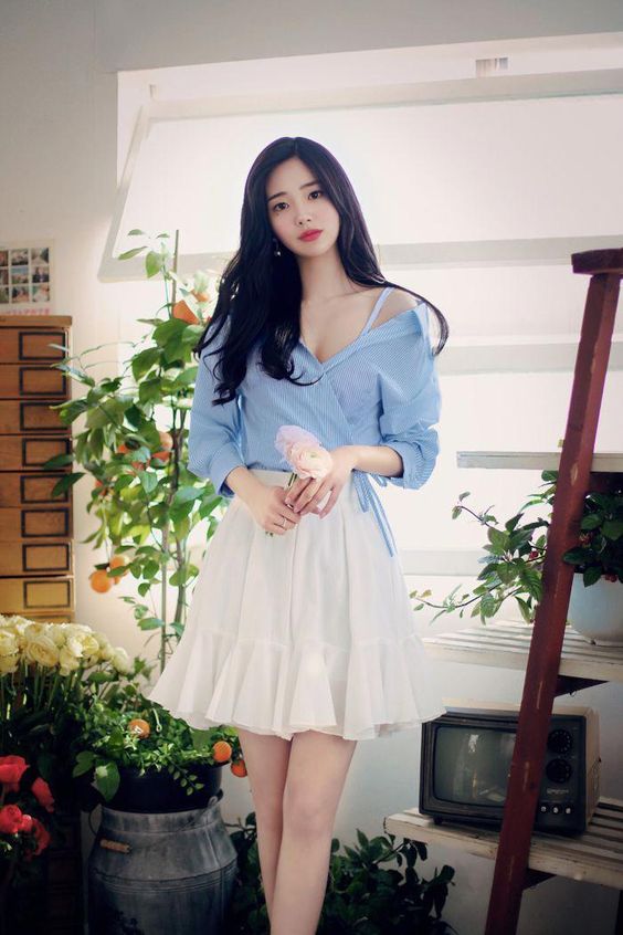 โทนฟ้า – ขาว ไปงานไหนก็รอด กับกระโปรงสีขาว กับเสื้อเชิ้ตเปิดไหล่สีฟ้า