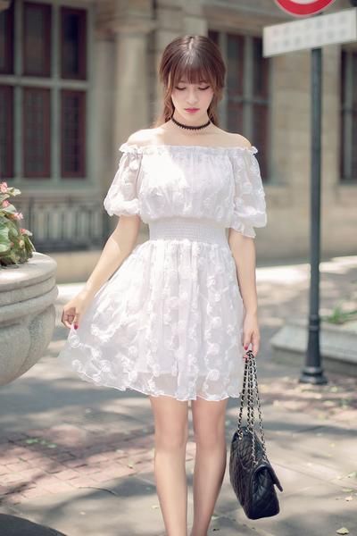 ชุดโทนขาวอีกชุดน่ารักสุดๆ กับเดรสสั้นสีขาวเปิดไหล่ เพิ่มความน่ารักด้วยผ้าซีทรูช่วงแขน