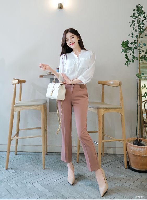 เรียบร้อยดูดดีกับสแลคสีชมพูใส่คู่กับเสื้อเชิ้ตสีขาว รองเท้าส้้นสูงสีครีม