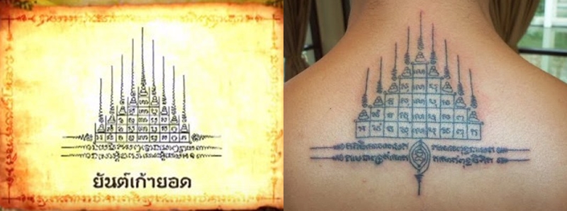 “ยันต์โสฬสมงคล” ถือเป็นยันต์อันวิเศษสุดกว่ายันต์ทั้งปวง ผู้สักมักจะสักยันต์นี้ไว้ที่กลางหลัง ยันต์นี้ประกอบไปด้วยเลขสามชั้น ชั้นนอกลงด้วยเลข 16 ตัว รอบกลางลงด้วยเลข 12 ตัว ด้วยสูตรตรีนิสิงเห รอบในลงด้วยเลข 6 ตัว ด้วยสูตรจตุโร แล้วทำการลงอักขระเพื่อล้อมรอบยันต์ทั้งสี่ด้าน พร้อมว่าพระคาถาบารมีสามสิบทัศ