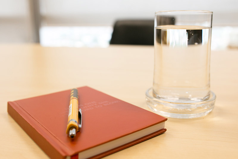 หมั่นหาแก้วน้ำที่มีน้ำเต็มแก้ว 1 ใบ มาวางไว้ข้างตัวคุณเสมอ ขณะคุณกำลังทำงาน เพราะมันจะทำให้คุณสะดวกต่อการหยิบขึ้นมาจิบไปเรื่อยๆ ขณะทำงานโดยไม่รู้ตัว โดยเฉพาะเวลาที่คุณต้องสุมหัวคิดงานกับเพื่อนๆ หรือเป็นอีกหนึ่งวิธีแก้ปัญหาหากคุณไม่ต้องการให้มือของคุณอยู่ว่าง