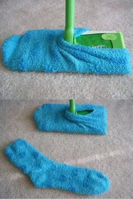 เพียงแค่นำถุงเท้าเก่ามาสวมกับไม้ถูพื้น ก็สามารถดูดซับฝุ่นละอองและเศษผมบนพื้นได้อย่างดี แถมยังไม่มีคราบน้ำเหลืออยู่บนพื้นอีกด้วย ช่วยให้คุณทำความสะอาดพื้นบ้านได้ง่ายขึ้นเยอะเลย