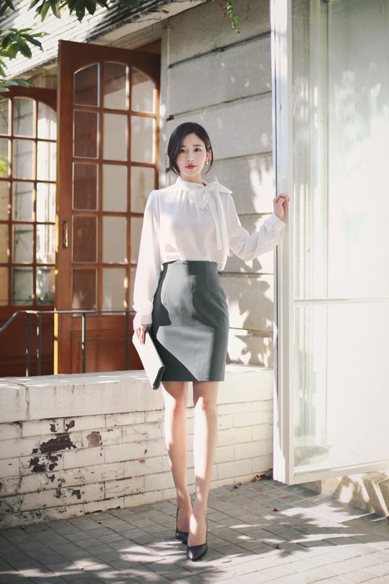 กระโปรงทรงกระบอกสีขาวยาวประมาณเข่า ใส่กับเสื้อเชิ้ตสีขาวดูเรียบร้อยละมุนตา