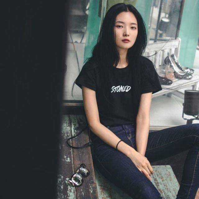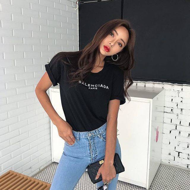 3.เสื้อยืดสีดำเข้าในกางเกงยีนส์เข้ารูป