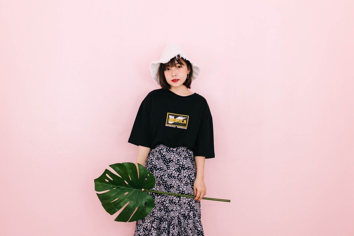 16.เสื้อสีดำโอเว่อร์ไซส์เข้าในกระโปรงหางปลาลายดอก
