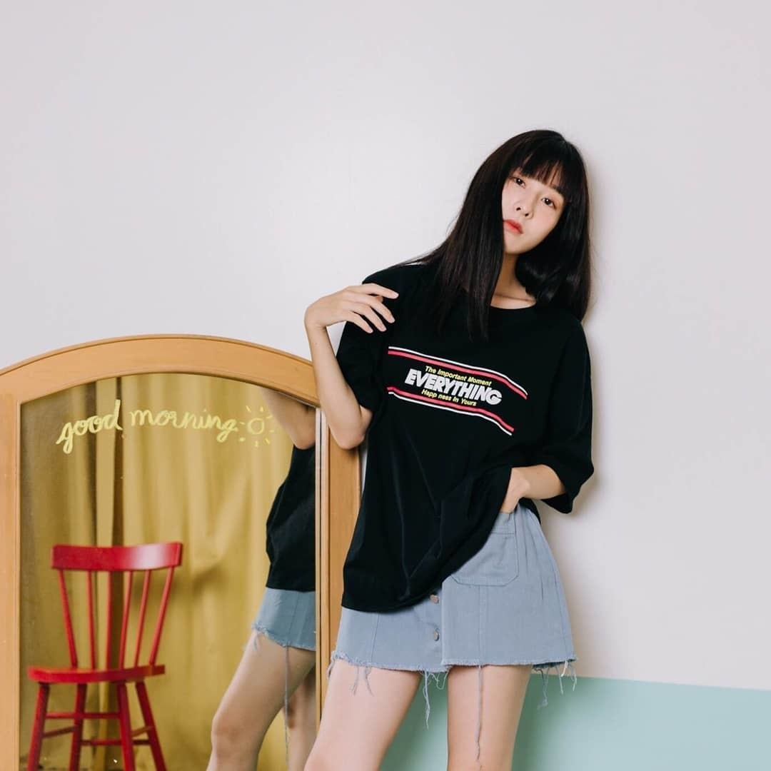 25.เสื้อยืดสีดำแบบโอเว่อร์ไซส์หับกางเกงยีนส์ขาสั้น