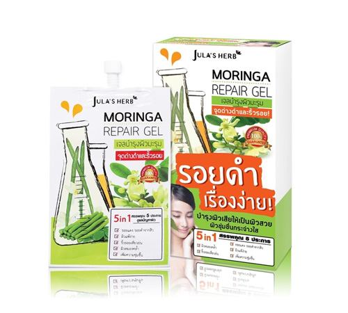 มากันที่ครีมซองเซเว่นตัวดัง Jula’s Herb Moringa Repair Gel ตัวนี้เป็นเจลบำรุงผิวมะรุม ที่มีส่วนผสมจากรูทินและเควอเซทิน ช่วยต้านอนุมูลอิสระ เพิ่มความขาวกระจ่างใสให้กับผิวหน้า พร้อมทั้งช่วยลดเลือนรอยสิว รอยดำ รอยแดง ให้จางลงผสานกับสารสกัดจากมะรุม และอาร์บูติน ยิ่งทำให้มีประสิทธิภาพมากยิ่งขึ้น ช่วยลดการเกิดของเม็ดสีผิว(เมลานิน) ที่เป็นต้นเหตุของความหมองคล้ำ ฝ้า กระ จุดด่างดำบนใบหน้า และช่วยเพิ่มความชุ่มชื้นให้กับผิว ทำให้ใช้แล้วไม่ต้องกลัวผิวแห้งตึงค่ะ