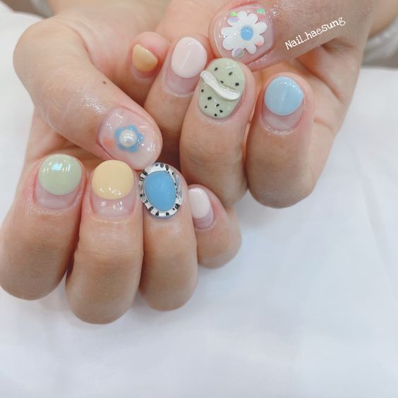แบบเล็บเจลใส เน้นโทนพาสเทสสีสดใส เพ้นท์สไตล์ 3D ให้เล็บมีมิติ น่ามอง เน้นลายการ์ตูนน่ารัก ๆ สายรุ้ง สีรุ้งต่าง ๆ