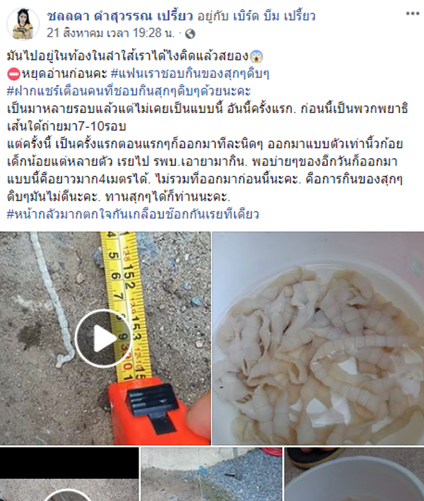 จากกรณีเฟซบุ๊คของคุณ ชลลดา ดำสุวรรณ เปรี้ยว ออกมาโพสต์เตือนภัยกรณีคนที่ชอบกินของสุกๆดิบๆ หลังแฟนหนุ่มของเธอมีอาการปวดท้องน้อย และคันบริเวณรูทวารหนัก พร้อมถ่ายออกมาเป็นพยาธิกว่า 10 รอบ วันนี้ GangBeauty เลยขอนำเสนอข้อมูลเกี่ยวกับ “พยาธิตัวตืด” ภัยเงียบสำหรับคนชอบกินสุกๆดิบๆ