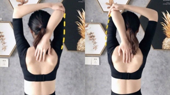 ต่อไปเราจะทำการยืดกล้ามเนื้อหลังและแขนให้ตรง โดยใช้มือขวาแตะที่หลังจากศีรษะลงมาให้สุดแรง จากนั้นใช้มือซ้ายเหยียดแขนขนานไปทางด้านซ้ายนับหนึ่ง สลับมาทำกับแขนฝั่งขวาไปมา ประมาณ 30 วินาที โดยทำสลับไปมาให้ครบ 3 เซ็ท และพยายามให้แขนขนานตรงให้ได้มากที่สุด เพื่อให้กล้ามเนื้อแขนได้ออกกำลังเพิ่มประสิทธฺการลดไขมันตามรอบแขนได้มากยิ่งขึ้น