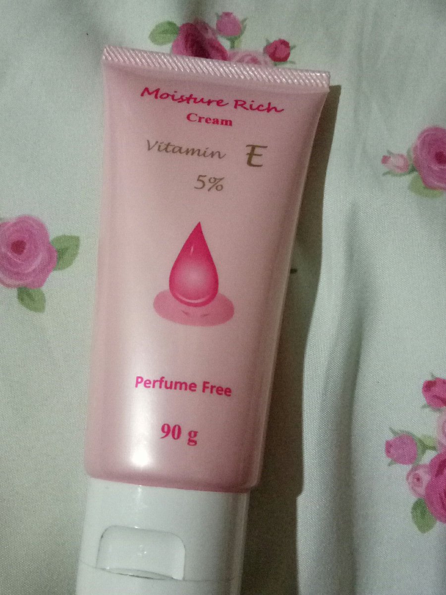 Moisture Rich Cream Vitamin E 5% เป็นครีมบำรุงที่มีส่วนผสมของวิตามินอีแบบเข้มข้น ให้มาถึง 5% เลยทีเดียว ไม่มีส่วนผสมของน้ำหอม สรรพคุณช่วยบำรุงให้ความชุ่มชื้นผิว ลดปัญหาผิวแห้ง แสบ แดง ลอก จากอากาศและยาทาสิวได้ดี ช่วยป้องกันการเกิดริ้วรอยก่อนวัย นอกจากนี้ช่วยลดรอยดำ จุดด่างดำจากสิวได้ด้วย