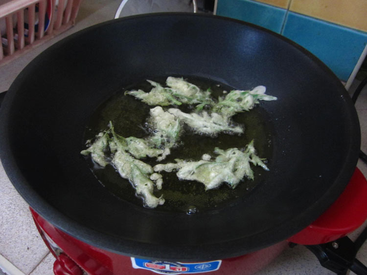 4. นำมาชุบแป้งที่ผสมแล้ว ทอดให้เหลืองด้านหนึ่งก่อนจึงกลับด้าน