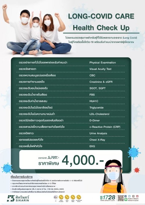 1. โปรแกรมตรวจสุขภาพสำหรับผู้ที่เคยติดเชื้อโควิด19 LONG COVID CARE Health Check Up / 4,000 บาท