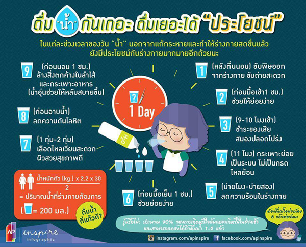 :ดื่มน้ำ 1 – 2 แก้ว หลังทานอาหารกลางวัน จะช่วยย่อยอาหารและช่วยขับของเสียออกจากร่างกาย