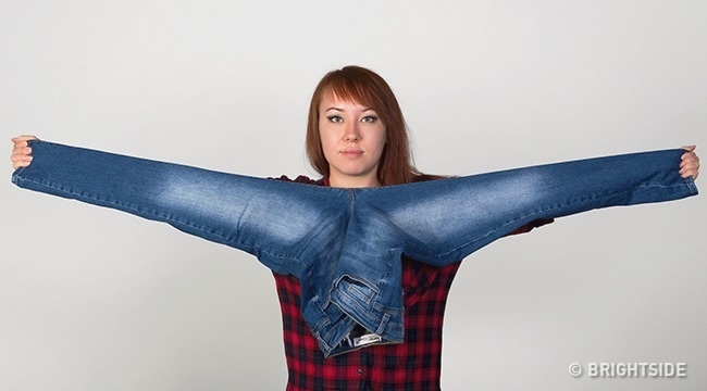 ส่วนสุดท้ายที่ต้องพิจารณาก่อนการซื้อกางเกงยีนส์สักตัวคือความยาวของขานี่แหละ มาดูกันว่ามันจะยาวเกินกว่าขาของเราไปมั้ยด้วยวธีนี้จ้ะ คือจับที่ปลายขากางเกงทั้งสองข้าง กางออกให้ตึงแขนที่สุดเท่าที่จะทำได้ ถ้าตรงเป้ากางเกงมันพอดีคาง ในระดับช่วงคอของเธอ ก็แปลว่า ใส่ได้ ซื้อโลดดดด