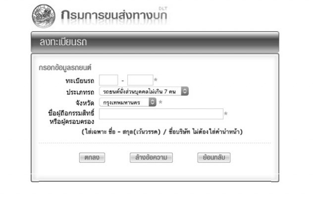 โดยการกรอกเลขทะเบียร ประเภทรถ และชื่อผู้ครอบครองให้ตรงกับที่จดทะเบียนไว้กับกรมขนส่ง