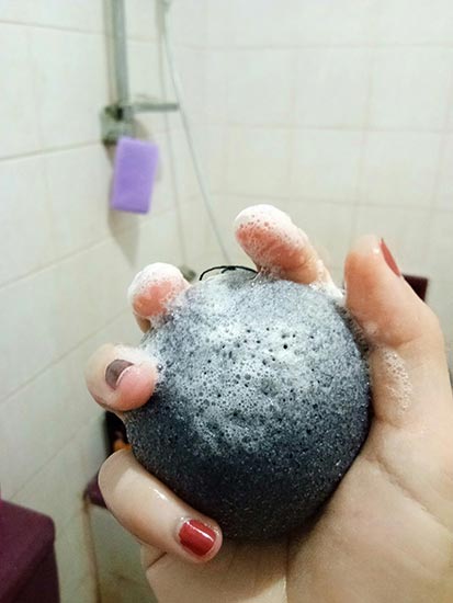 1. ฟองน้ำขัดหน้าจะมีลักษณะเป็นผิวขรุขะ  เวลาใช้ให้ร่วมกับโพมล้างหน้าหรือสบู่ล้างหน้า (ส่วนตัวแล้วชอบใช้สบู่ล้างหน้า handmade เดี่ยวครั้งหน้าจะมาเล่าให้ฟังน่ะว่าทำไหมถึงชอบใช้) วิธีการขัดให้ขัดเหมือนตามร่างกายคือ ขัดเบาๆ วนกลมๆไปเรื่อย เริ่มที่หน้าผาก รอบตัวตา ต่อด้วยแก้ม สุดท้ายที่ค้าง และลำคอ