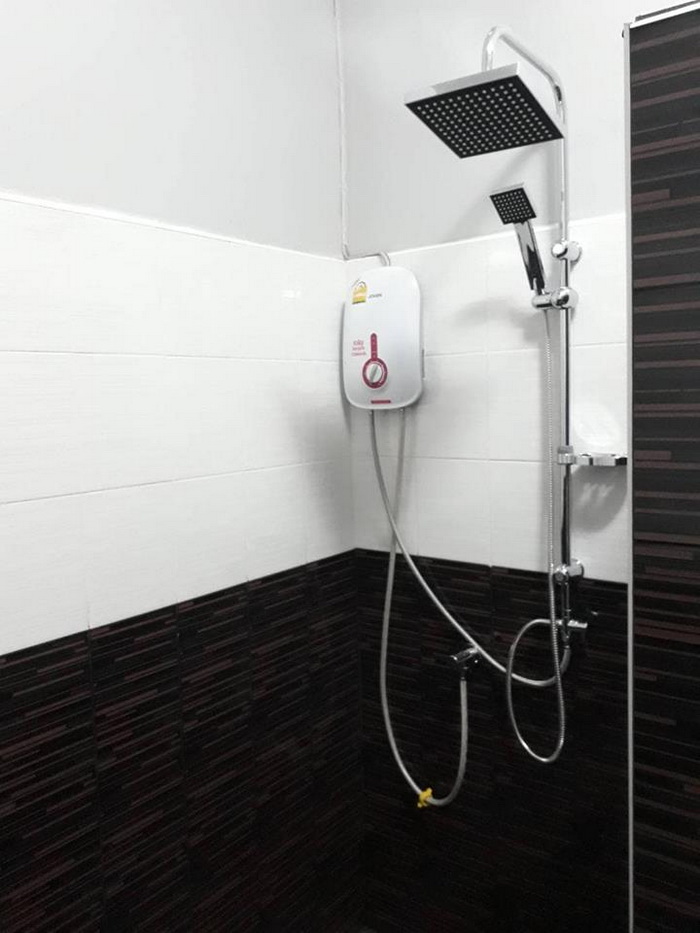 ห้องน้ำขนาดกะทัดรัด ตกแต่งอย่างสวยงามและทันสมัย พร้อมการออกแบบที่เรียบง่าย เน้นประโยชน์ใช้สอย ติดตั้งอ่างล้างหน้า ชักโครก ไว้ในส่วนหน้า แยกโซนอาบน้ำด้วยผนังกั้นไว้ทางด้านหลัง