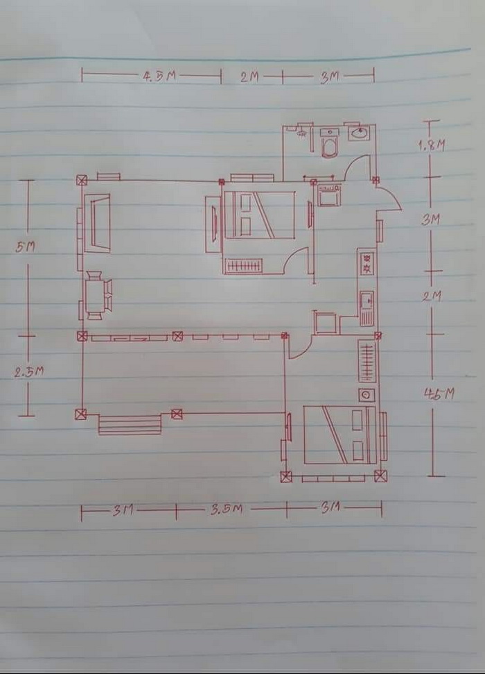 ในส่วนของแบบแปลนบ้านหลังนี้ คุณเดชา ได้ทำการออกแบบด้วยตัวเองโดยการวาดลงบนกระดาษ ทำให้ไม่ต้องเสียค่าจ้างสถาปนิกครับ