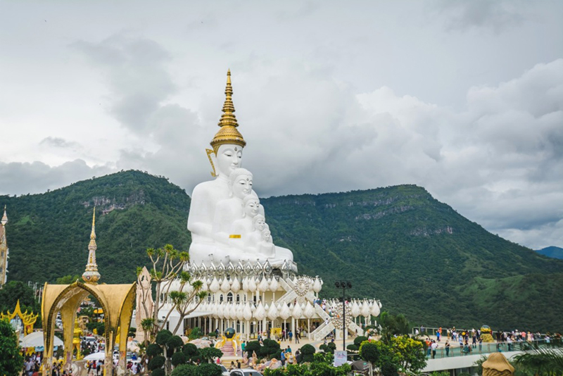 ที่เที่ยวเพชรบูรณ์ วัดพระธาตุผาซ่อนแก้ว แลนด์มาร์กที่คนมาเขาค้อจะต้องแวะมากัน มีพระพุทธเจ้า 5 พระองค์ ซึ่งเป็นพระพุทธรูปสีขาวตั้งโดดเด่นมองเห็นมาแต่ไกล ภายในวัดประดิษฐานเจดีย์พระธาตุผาแก้ว รูปทรงดอกบัว 7 ชั้น ตกแต่งสวยอลังการด้วยถ้วยกระเบื้องและหินสีต่างๆ แถมเรายังมองเห็นทิวทัศน์ภูเขาโดยรอบได้จากบนนี้ด้วย