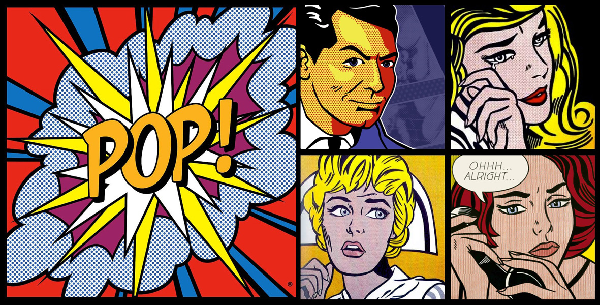 Pop Art จะมีคาแรคเตอร์ที่ต่างๆกันไป ส่วนใหญ่จะวาดโดย Roy lichtenstein และงานสีสันสดใสอื่นๆของ Andy warhol