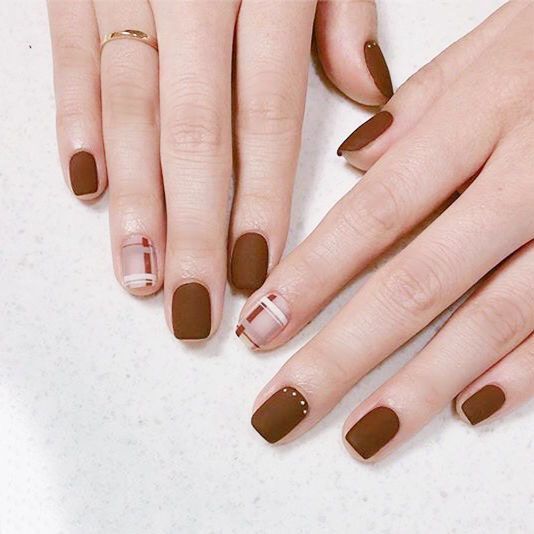 หรือจะมาในแนวเรียบๆ หรูหรา ด้วยการทาเล็บสีน้ำตาลเอิร์ธโทนอ่อนๆ สลับกับเพ้นท์ลายสก็อต ก็มินิมอลแบบสุด