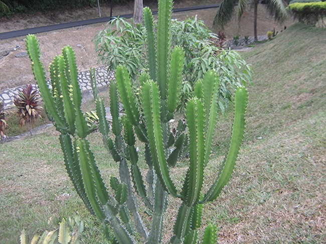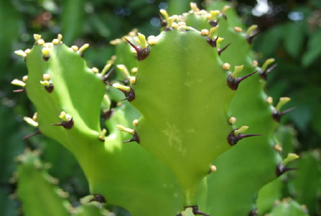 นี่ก็เป็นญาติของกระบองเพชรอีกหนึ่งชนิด สูงประมาณ 3-6 เมตร มีหนามทั่วทั้งลำต้น ปกคลุมตามข้อต่อใบและภายในยังมียางสีขาวที่เป็นพิษด้วย! ถ้าโดนเข้าไปก็ระคายเคือง ยิ่งถ้าแพ้ก็ทำเอากรี๊ดแตกได้เหมือนกัน ดังนั้นคนที่รักต้นไม้ ก็เลยมักชอบที่จะปลูกเจ้าสลัดไดเอาไว้รอบรั้วบ้านเพื่อป้องกันทั้งคนทั้งสัตว์ที่ไม่อยากให้เข้าบ้านนั่นเองจ้ะ