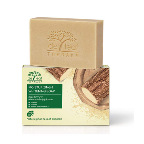 De Leaf Thanaka Moisturizing & Whitening Soap เป็นสบู่ที่มีส่วนผสมของทานาคา และขมิ้นชัน ช่วยทำความสะอาดผิวได้อย่างมีประสิทธิภาพ พร้อมกับช่วยต่อต้านริ้วรอย ช่วยผลัดเซลล์ผิวที่ตายแล้วออกอย่างอ่อนโยน ให้ผิวขาวกระจ่างใสขึ้น และมีส่วนผสมของวิตามินบี3และอี ช้วยให้ผิวเรียบเนียนขึ้น ไม่ทำให้ผิวแห้ง และไม่มีส่วนผสมของสาร SLS ค่ะ