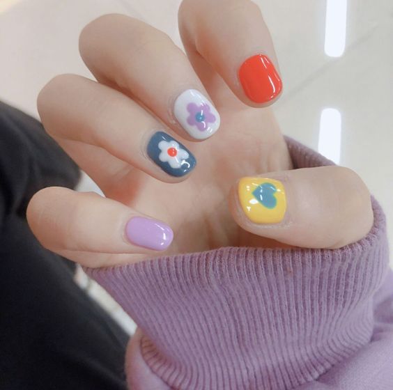 ลายดอกไม้บนโทนสีสดใส ช่วยให้เล็บน่ามองมากยิ่งขึ้น