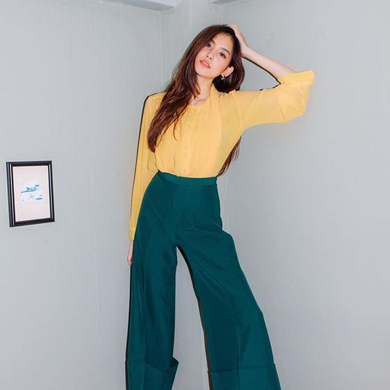 กางเกงขาบานกับเสื้อเชิ้ตเหลืองก็เข้ากันนะคะ