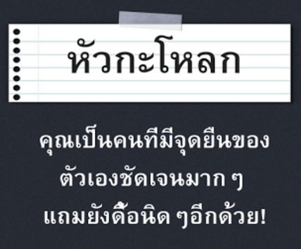 คุณเป็นคนที่มีจุดยืนของตัวเองชัดเจนมากๆ แถมยังดื้อนิดๆอีกด้วย! คุณชอบทำงานที่ได้รับมอบหมายอย่างเต็มที่ หากคุณแน่วแน่กับสิ่งไหนแล้ว ไม่ว่าจะมีความเจ็บปวดหรือ อุปสรรคยากลำบากอะไรเข้ามา คุณจะแก้ไขมันด้วยวิธีการของคุณเองจนสำเร็จ! อาจเพราะเชื่อมั่นในตัวเอง มันทำให้บางทีคุณมีปากมีเสียงกับผู้ร่วมงาน หรือคนรอบตัวบ้าง แต่ก็นั่นแหละ เพราะคุณไม่ยอมแพ้อะไรง่ายๆ และอยากจะทำมันให้ดีที่สุด และผลสำเร็จก็มักจะเป็นของคุณอย่างไม่ต้องสงสัยเลยล่ะ~! ว้าว คุณมีข้อดีแบบนี้นี่เอง!! การทำให้เต็มที่ที่สุดด้วยจุดยืนที่เข้มแข็งของคุณเอง รวมถึงผลสำเร็จที่ได้มาเป็นข้อเด่นของคุณเลยล่ะ!