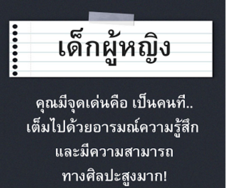 คุณมีจุดเด่นคือ เป็นคนที่เต็มไปด้วยอารมณ์ความรู้สึก และมีความสามารถทางศิลปะสูงมาก! เนื่องจากจิตใจเต็มไปด้วยความรู้สึก ทำให้กลายเป็นคนอ่อนไหวง่าย ไม่ว่าจะเรื่องเล็กน้อยแค่ไหนมากระตุ้น คุณจะรับรู้และรู้สึกได้ง่ายๆเสมอ~ และคุณก็เจ๋งตรงที่นำเอาสิ่งที่คุณรู้สึกมาถ่ายทอดเป็นข้อความ, บทกวี, ภาพวาด, เพลง หรือศิลปะอีกหลายๆด้าน แต่แม้ว่าคุณจะสุดยอดกับเรื่องนี้มากๆ แต่ด้วยความอ่อนไหวง่าย อาจทำให้บางทีก็โกรธโมโหง่าย หรืออาจคิดมากเกินจำเป็น อ้อ แล้วคุณก็เป็นพวกที่จำแนกการกระทำต่อคนที่คุณรู้สึกดี และรู้สึกไม่ดีด้วย ออกจากกันอย่างชัดเจน จนบางครั้งอาจทำให้มีการเข้าใจผิดเกิดขึ้นได้ง่ายๆ ระวังๆหน่อยก็ดีเหมือนกันนะ! ว้าว คุณมีข้อดีแบบนี้นี่เอง!! ความสามารถในการสรรค์สร้างงานศิลปะ จากอารมณ์ความรู้สึกของตัวเองได้นี่ เท่จริงๆเลย!