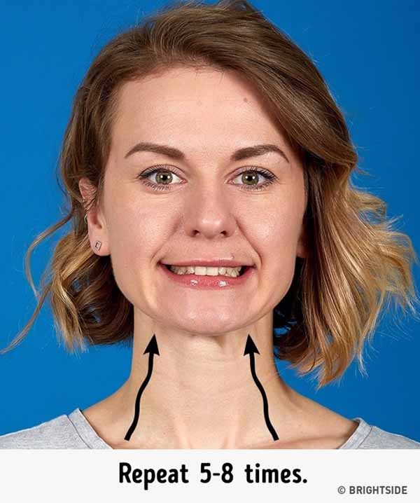 เงยหน้าขึ้น มองเพดาน แล้วยื่นปากออกไป คล้ายท่าจูจุ๊บ จนรู้สึกได้ว่าตึงบริเวณคอ ทำท่านี้ค้างไว้ประมาณ 5 -8 วินาที ทำซ้ำอีก 5 ครั้ง