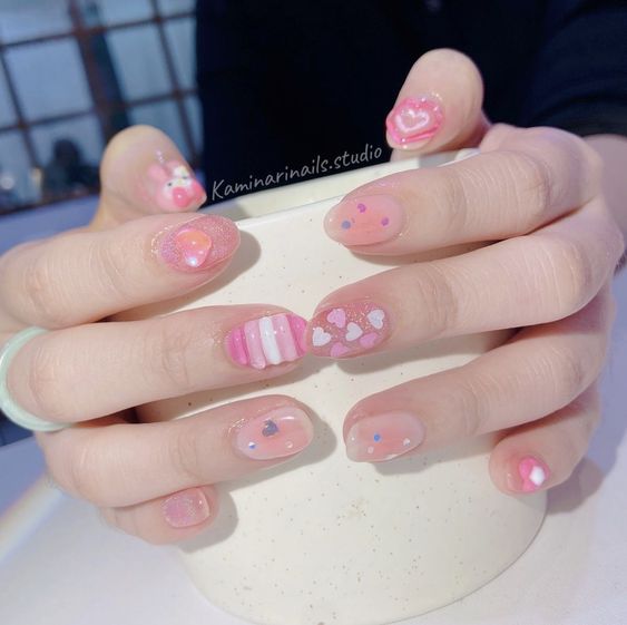ลายเล็บสีชมพูแบบสดใสๆ แบบไม่ซ้ำลายกันเลยค่ะ