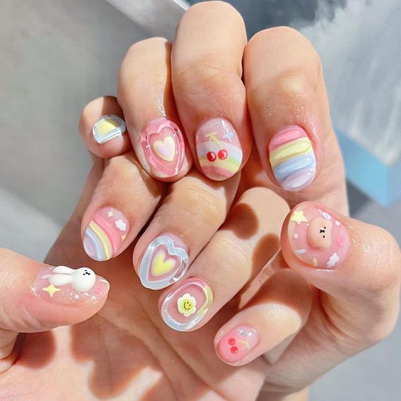เล็บสีชมพูสดใสตัดกับสีขาว กับลายคุณกระต่ายและหัวใจ