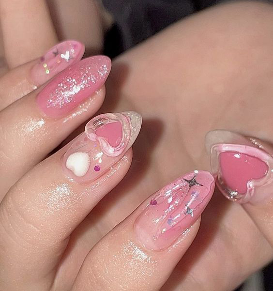เล็บสีชมพูแบบออมเบร ประดับด้วยคริสตัส และหัวใจ 3D