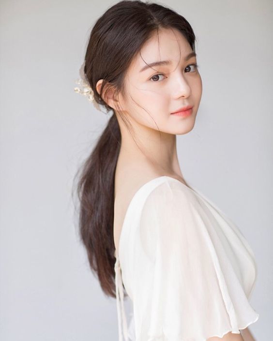 1. แสกข้าง รวบต่ำ แล้วปล่อยปอยผมออกมาด้านข้างเล็กน้อย